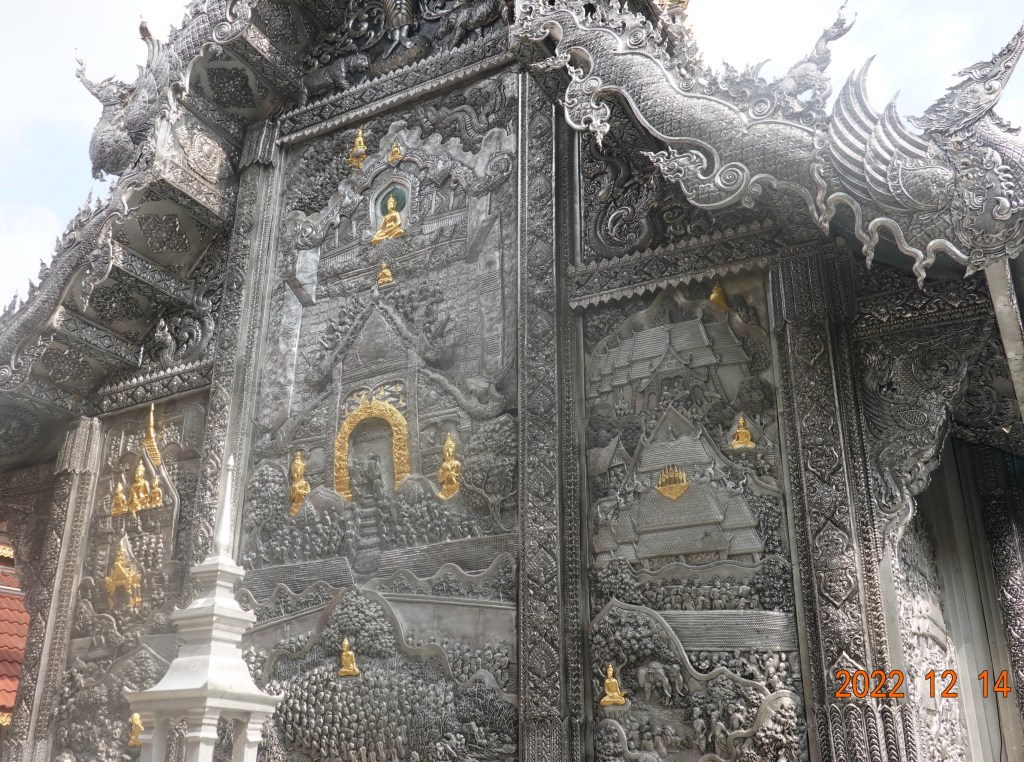 The craftsmen at Wat Sri Suphan work with nickel and aluminium for the ordination hall, although there is also some silver used in the construction of important images. The effect is certainly dazzling and unusual with a mass of repoussé and chased work, as well as carved figures, covering the exterior and interior and certainly makes for a great photographs.