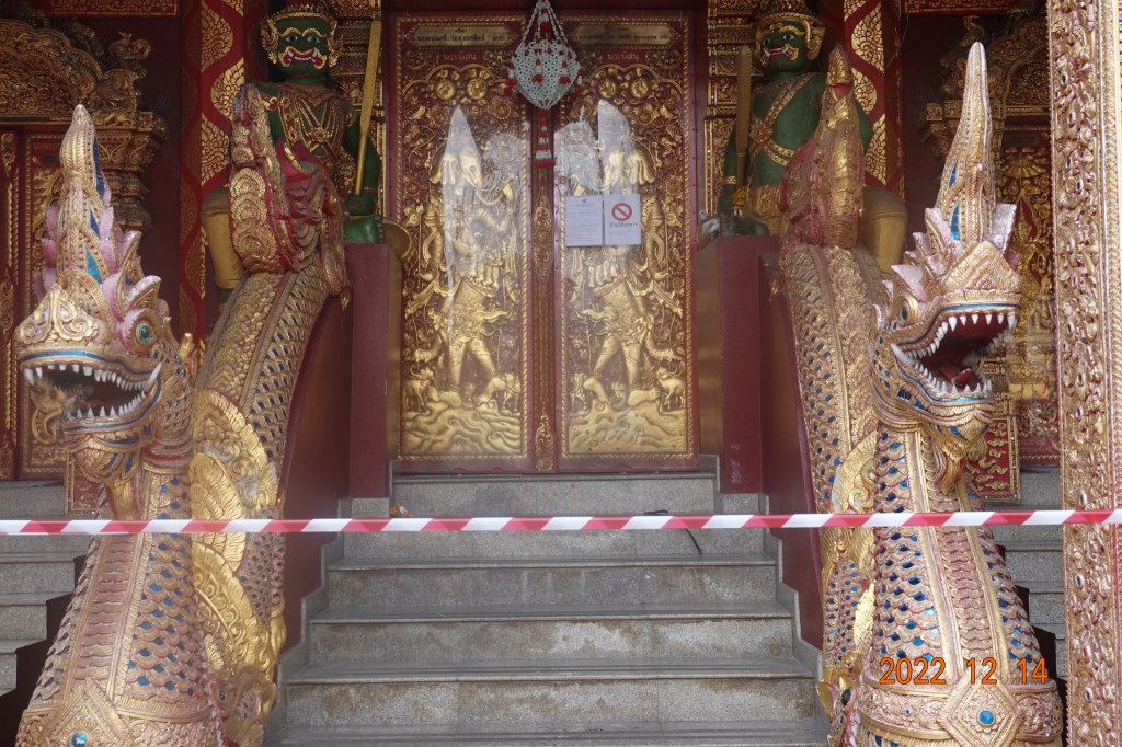 The rainy season this year saw much more and more intense rain than in typical years. The chedi at Wat Sri Suphan became undermined and collapsed. The area had been blocked off after growing cracks were seen. Here is the link to a YouTube short videl showing the collapse of the chedi: https://m.youtube.com/watch?v=w1OXkJapahE. I first went to see the state of the collapsed chedi. Here is what I saw.