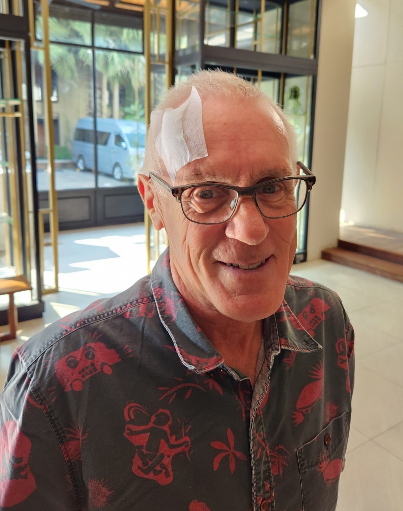 Walked back to The 3-Sis to get my passport, and Boom took one look at me and also said that I need to get that looked at. I told him I was on my way, just stopped in to get my passport. At 9:30 PM, I got a Grab ride to Chiang Mai Ram, and was apprehensive of a possible long wait. Got to Ram, went into the Emergency department, gave them my passport, and they immediately took me to a treatment room. One nurse was asking what happened and other questions, like “did you lose consciousness? did to fall over? did you become dizzy? did you become nauseous?” The other two nurses removed the bandaid and started cleaning the bump and wound. Fast service. Within about 15 minutes from the time I arrived, the doctor came in, asked many of the same questions again (probably to make sure I give the same answers to veryify my thinking is clear), inspected the wound and told me it would need stitches to heal properly. So I have five stitches in my head now. (Not the first time, my head has experienced a few cuts and bruises along the way.) And they want me to return every day to have the wound cleaned and the dressing changed. And they want me to take an antibiotic to ensure no infection comes. They also gave a medication with codeine for the pain. (Pain not too bad, I did take one of the pain pills the first night.) Stitches come out in a week. Got a Grab ride back to The 3-Sis, and was there before 11:00 PM. Overall less than 90 minutes.