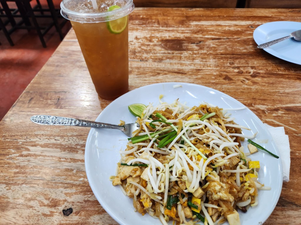It is Sunday, so the weekly Sunday Night Market is in full force. Two roads that cross, Prapokkloa and Ratchadamoen are closed, and crafts, clothing, and food vendors set up along those roads. Because people can walk in the street, it is commonly called “Walking Street.” It is a social event for many Thais, and shopping event for tourists, so it is always crowded. Having been here for many years, the Sunday Night Market is essentially the same every week. Feeling no need to be in the slow-moving crowds, I wend further away to Mush for dinner. Here is my dinner at Mush, stir-fry vegetables with chicken,and a lemon iced tea: