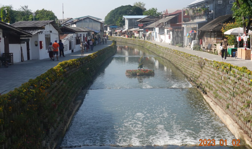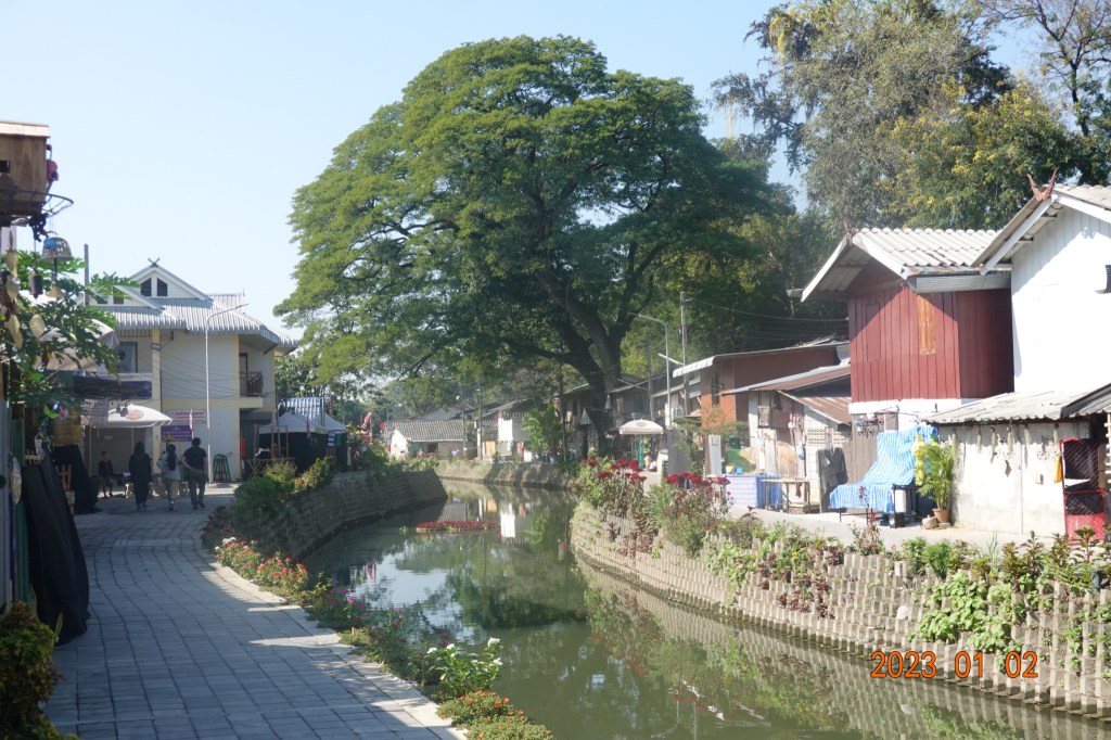 From the same bridge on the other side of Rangang Road looking south, this is the recently improved section. The klong itself has been cleaned up, the paths installed on either side, and a few bridges installed to allow people to move from side to side. The people living along here have created shops and sell coffee, drinks, trinkets, handicrafts, etc. This has become a very trendy place to visit, especially in the early evening.