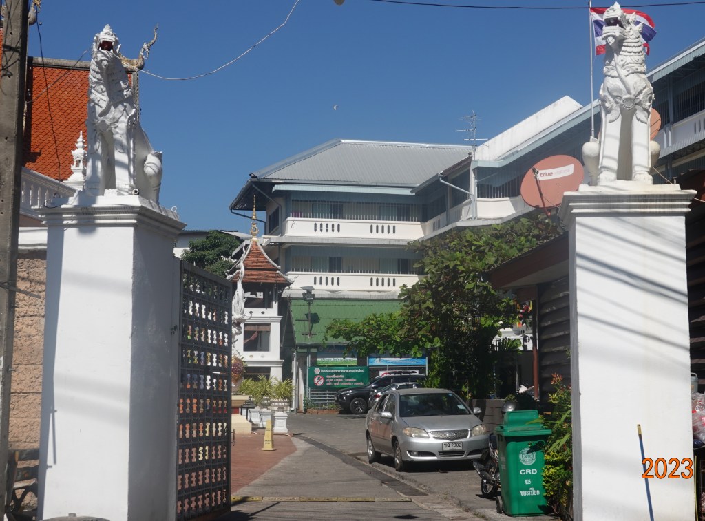 When I walk to the O2 Gym, I pass by Katam Corner, the southwest corner of the old city wall, and go down Sridonchai Road, passing the entrance to Wat Phuak Chang. Walking past the entrance, it is almost possible to miss it as it blends in as if part of a long wall. From across the street, it is also not prominent, partially obliterated by the many communication and maybe power cables: