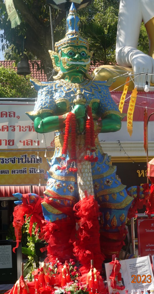 And by a large outdoor seated Buddha was this very colorful yak. I love the yaks (also known as yaksha). They are seen much more in central Thai temples than in the north, former Lanna. Not at all rare in the north, but not as common. A yaksha is a guardian, belonging to a broad class of nature-spirits, usually benevolent, but sometimes mischievous. They are connected with water, fertility, trees, the forest, treasure and wilderness. Yaks are most often depicted as fierce looking figures with large bulging eyes, fangs and skin of various colors, typically carrying a large weapon. And most often, there is one on each side of a temple entrance.