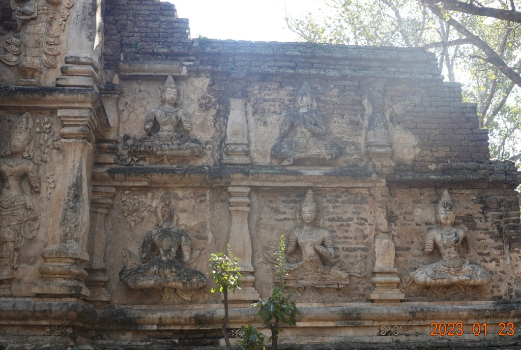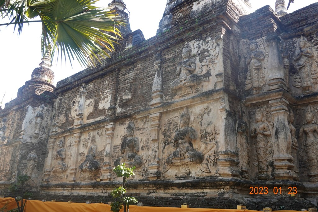 From where I stood taking the picture of the Tilokarat Chedi, I walked to the right to view the very old windowless viharn. This is unique because of the carved depictions of thewada (angelic beings that live in the heavenly realm) on the sides. In Thai, jed (or ched) is “seven” and yod (or yot) is “spire.” In the next photos, some of the seven spires on the roof are visible. The carved thewada are what draws me to this building – that carved stucco is almost seven hundred years old.
