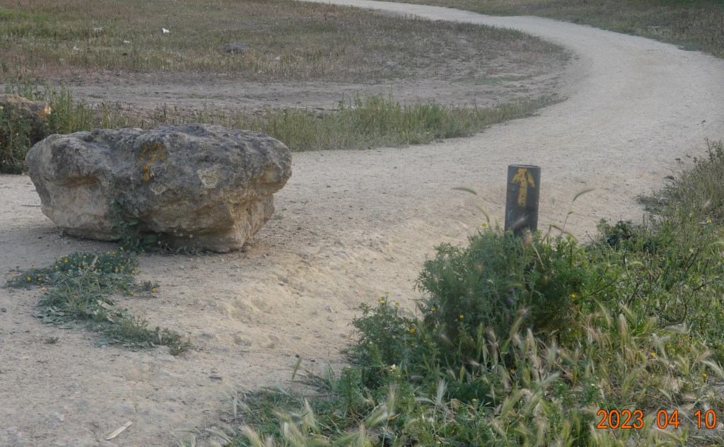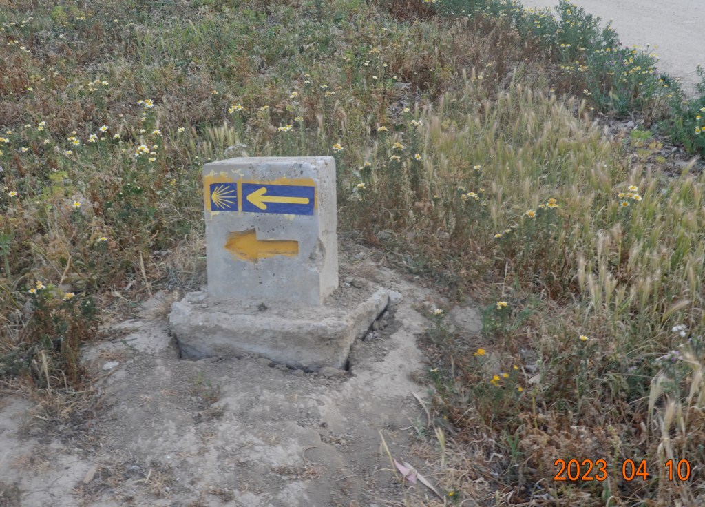 From the cathedral, we crossed the river, and after negotiating fairly heavy Monday commuter traffic, we got out to the Via de la Plata path. We were confident that we were on the path when we saw the first yellow arrow, a very unofficial-looking hastily-painted arrow on a post:
