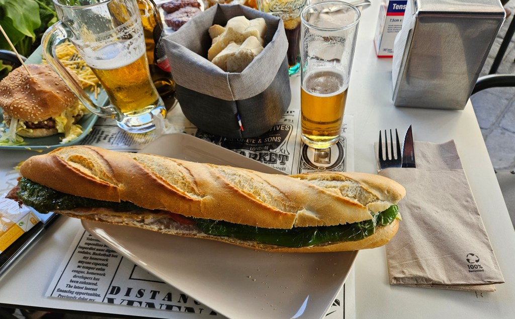 Tom had a bocadillo. In Mexico, a bocadillo is a one-bite appetizer, what here might be called a “tapa.” In Spain, a bocadillo is a VERY large sandwich, essentially a baguette sliced and filled with various things. Here is Tom’s bocadillo.