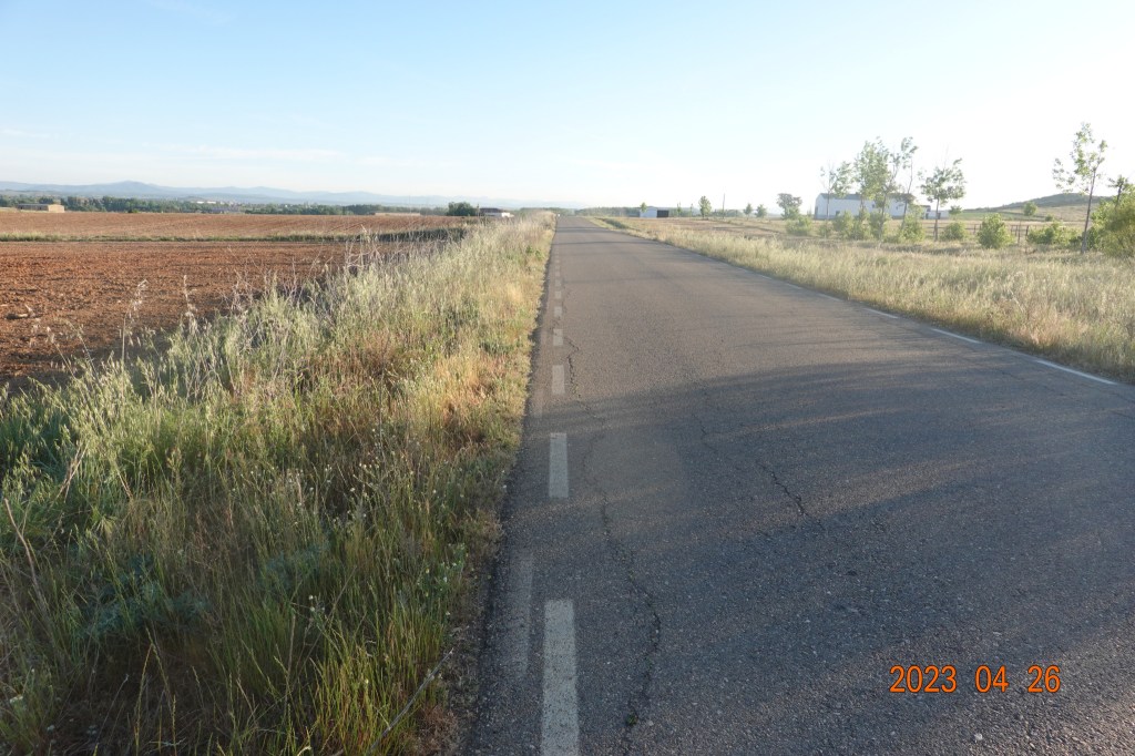 Today is the second half of our having broken up the 38-kilometer stage that some of the traditional guidebooks suggest into two approximately 20-kilometer stages. The day started a little warmer than recent days at 13 C (55 F), and I did not even consider using my jacket. It is expected to reach 30 C (86 F) today, and we are happy that even though we got a bit of a late start at 8:10 AM, we will not be walking in the heat of the mid-to-late afternoon. Here we are saying goodbye to the private apartment accommodation in Riolobos.
