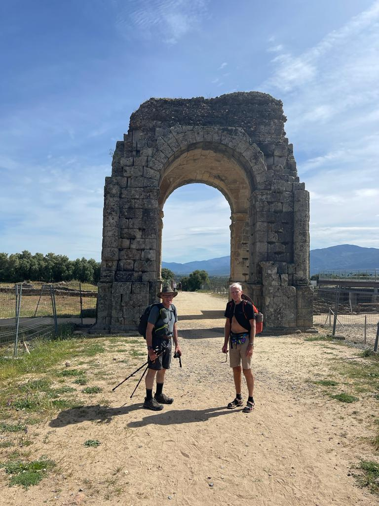 We came to what was the Roman town of Cáppara. Much of the old Roman town has been excavated and is on display. We stopped at the visitor center and walked around the ruins for a while. We are seeing a LOT of Roman ruins on this Camino route. This is not a surprise, since the Via de la Plata follows or is very close to the Roman road from the Roman military enclave at Astorga in the north, south to Seville, and on to the ports at Cadiz and Malaga. Javier took a photo of Tom and me at the large Roman arch.