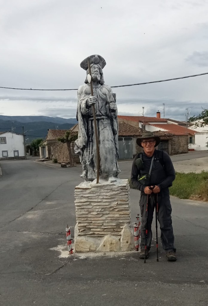 We stopped at a small village of Calcerde de Valdelacasa for coffee, water, orange juice, and toast with jam. Tom took my picture posing next to a statue of Saint James as a pilgrim in the town square.