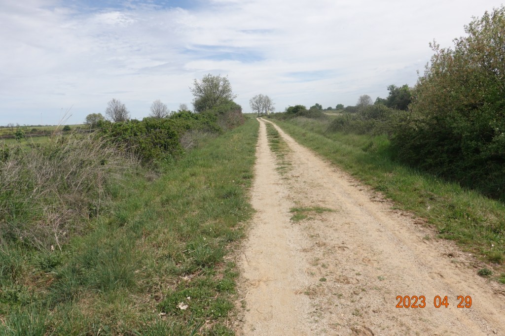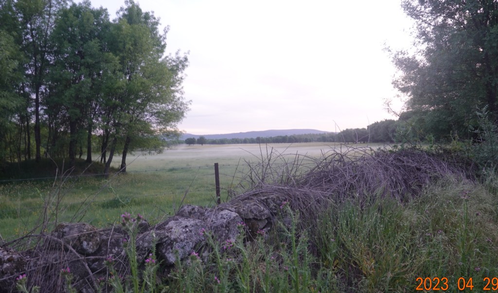 We left Calzada de Béjar relatively early, glad to be leaving that tiny village. After a short stretch on a secondary paved road, were soon walking on natural paths, almost no road walking for the first part of today. When I say “natural path” I really mean a non-paved dirt or dirt/gravel/rock farm road away from highways or secondary paved roads. This is what we prefer since the paved highways and other roads come with traffic. Typically there is not much traffic, but the natural paths through farmland or other undeveloped land is far preferable to having to be concerned about safety when cars approach, sometimes too fast (or so it seems to us walking).