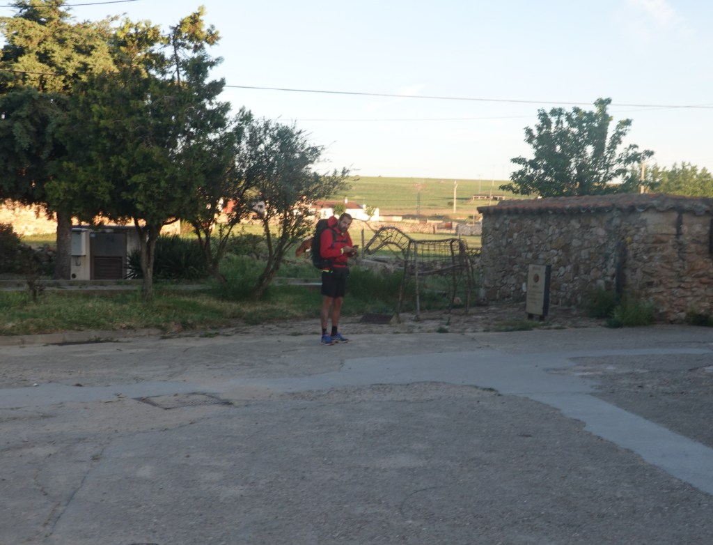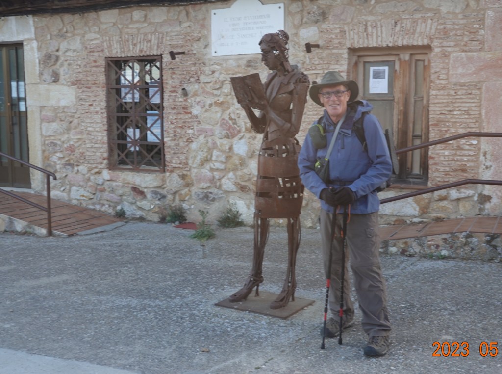 The day started out cool again in the early morning at 11 C (52 F) and soon warmed so that a jacket was not needed. Here I am leaving Morille at a sculpture in front of a local library. Morille is a town and albergue that I am happy to forget.