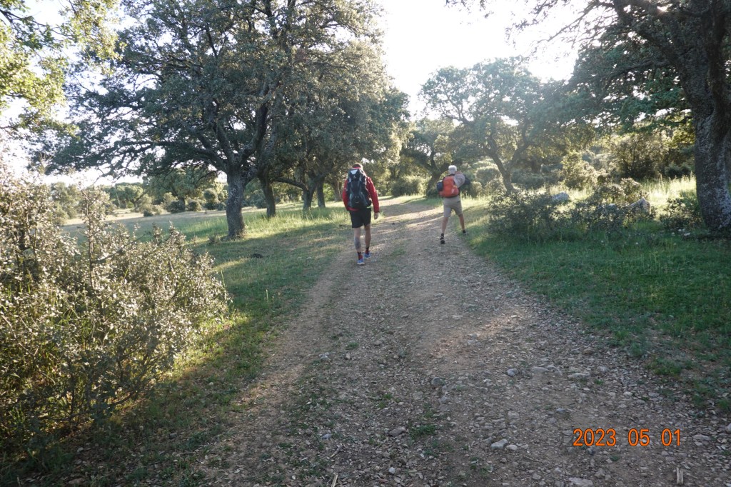 Tom and Javier ahead of me on another natural path through farmland, sometimes in the shade of trees, sometimes in vast open fields.