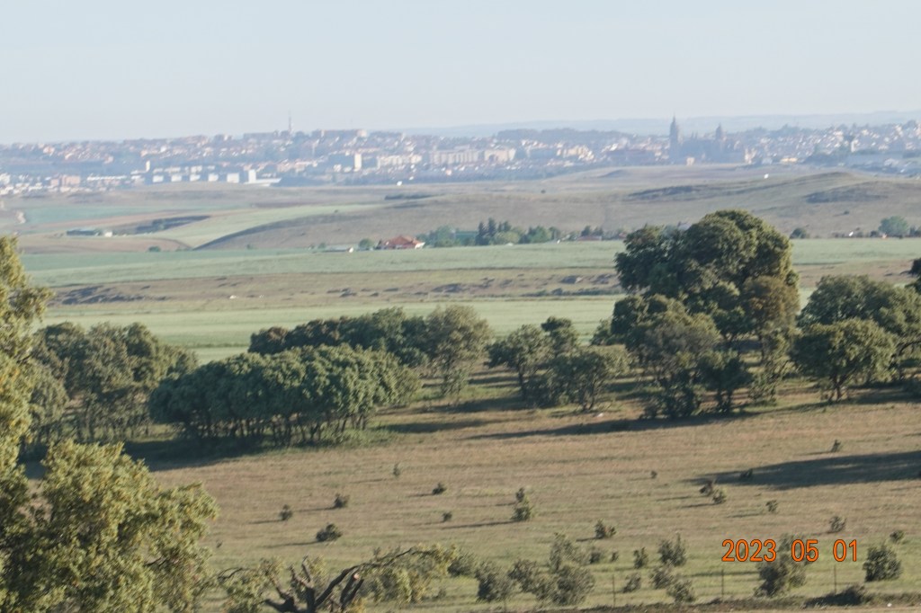 As noon approached, over a hill far in the distance, we had our first view of Salamanca. There is still a long, long way to go, but now we know it is there, and our minds race with anticipation even though our pace does not quicken.