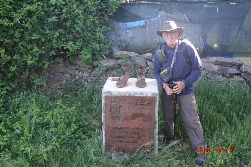 We stopped for a cafe con leche in a little town. Leaving the town we saw saw this sculpture of two pilgrim’s shoes and the distances to some towns. Seven kilometers to Salamanca, 75 to Zamora, and 169 to Astorga. So, for us, 7 more kilometers to Salamanca.