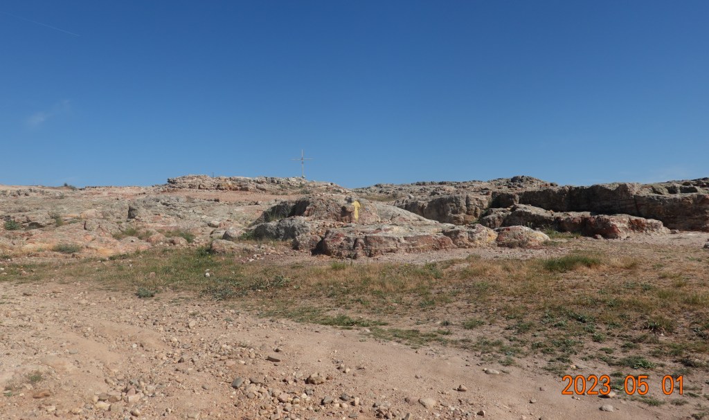 At the top of that last rise, we had to negotiate some rather difficult rocks to get to the top and then descend into Salamanca. This is the price we pay for the descent into Salamanca and our rest day. In the middle of the photo you can see the yellow arrow, so we know this is the way.