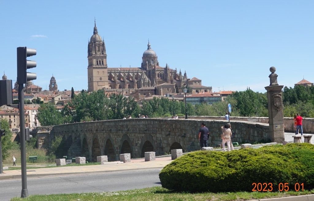 Down and through the outskirts of Salamanca, we cross this very old Roman bridge into the old town.