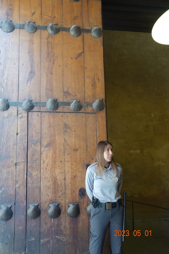Right around the corner is the historic and (we are told) very important old library. On the doors are Camino shell icons. The guard here, when we told her we were pilgrims, took us inside and gave us a stamp in our credentials.