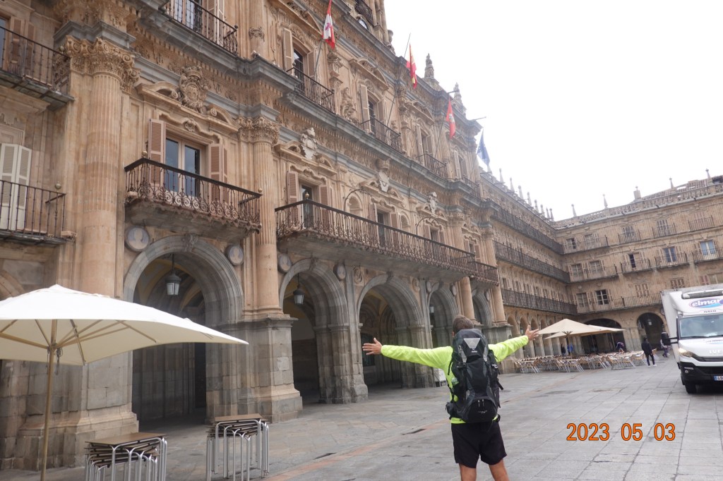 We started the day in Salamanca, a city with a charm and feeling we hated to bid farewell to. The Camino path took us right through Plaza Mayor and I got a photo of Javier saying goodbye to Plaza Mayor.