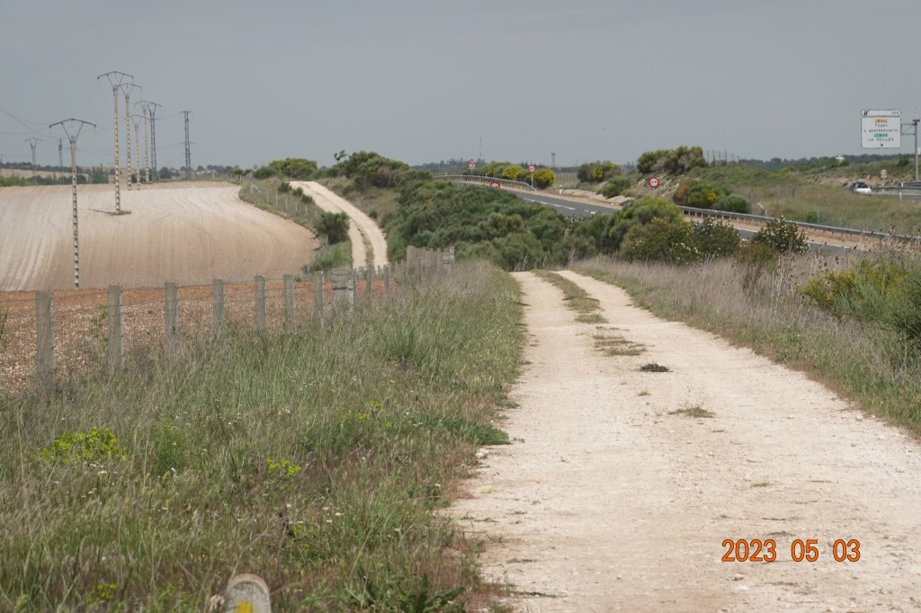 The Camino path is well-marked here with these parallel stone short pillars directing us on the Camino path. Here the Camino path goes under the highway to cross around a marshy, often flooded area. And today that area is flooded, so we had to walk around, longer but safer.