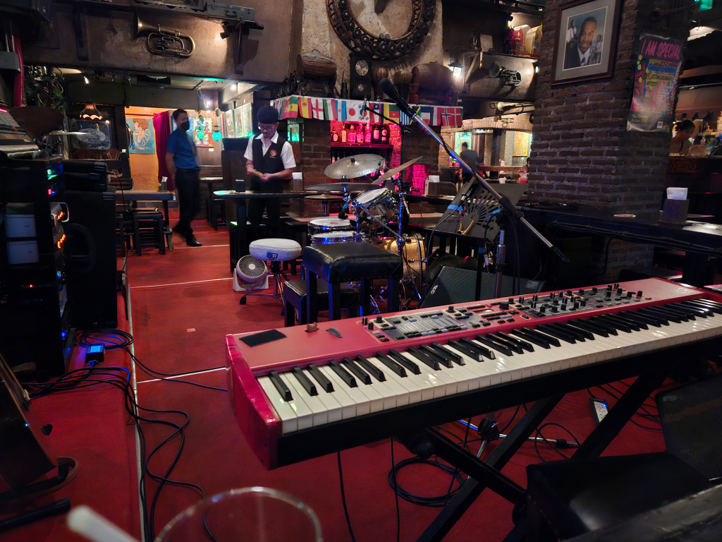 Inside, this is mostly a restaurant with an area in the middle of the main floor set aside for musicians. I was seated at a low bar along the band / musician area. Here is the view from my seat: