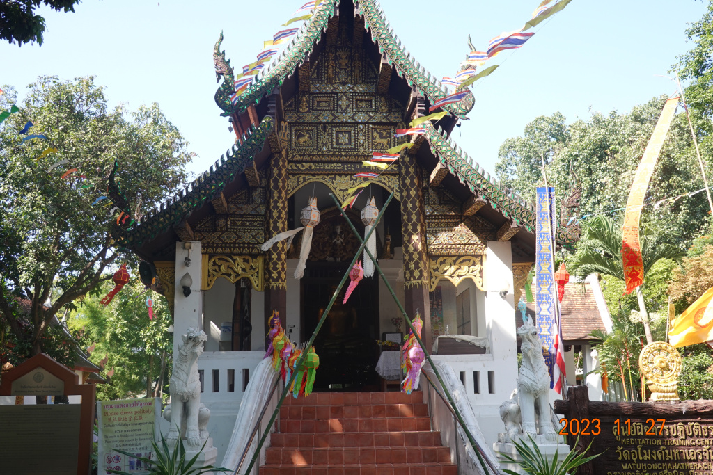 The viharn is Lanna-style (Lanna was the kingdom making up northern Thailand and Laos before Lanna and Siam merged in the later 1800s), guarded by two Singhs (mythical lion-like creatures) and no naga (dragons) on the stairway banisters: