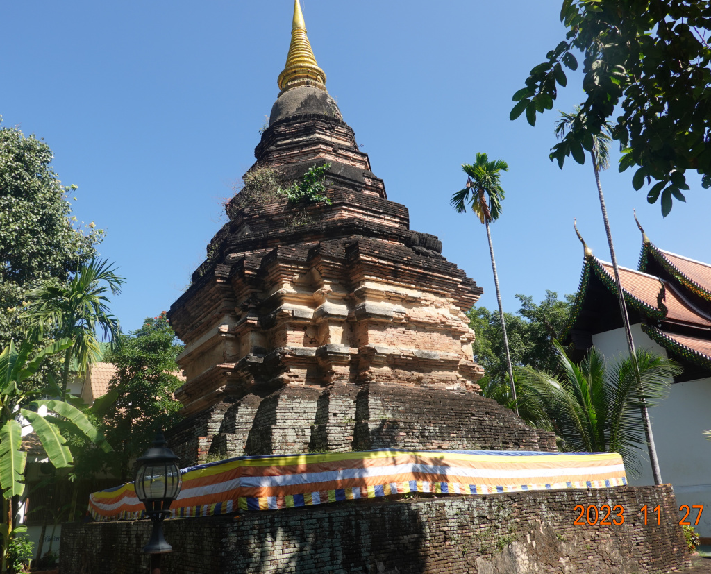 Just south of the viharn is this very old chedi. It is slightly smaller than the main chedi, looks older and in less pristine condition. It is unusual in that it is hollow, almost like a mixture of a chedi and a very small viharn (worship hall) :