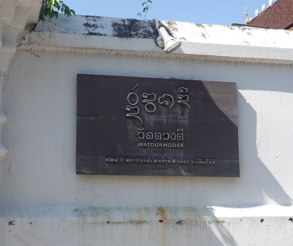 Wat Duang Dee, sometimes spelled Wat Duang Di. This is known as the “Good Luck Monastery.” The word “di” (more often spelled “dii” because of the slightly elongated “ee” sound) means “good” in Thai. If something is good, you say “dii” and if it is very good, you say “dii mahk”. If something tastes good, the word is “aloy” and if it tastes very good, you would say “aloy mahk” or “aloy mahk mahk” for very, VERY good. This is just down the street from The 3-Sis, but down a soi (lane) just off the main road very near the Three Kings Monument. Today I was coming in from a small soi leaving the back of Wat Umong Mahathera Chan.