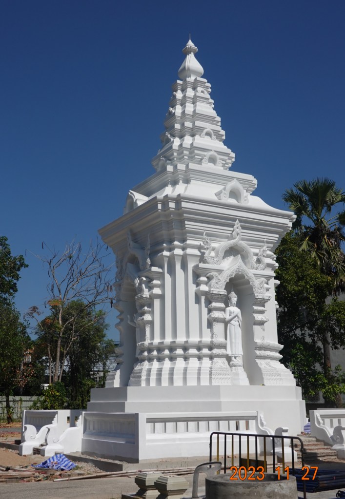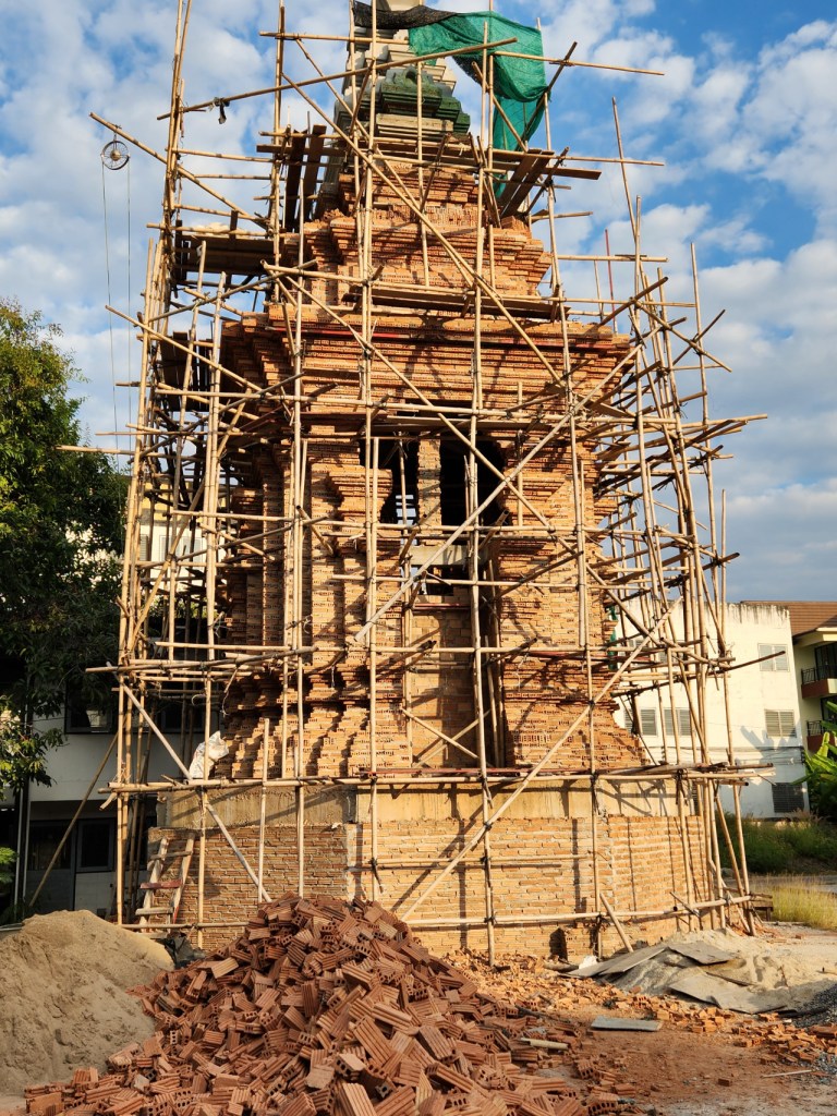 A year ago I saw a temple in the process of being constructed. Being that there are at least 50 temples in the old Chiang Mai city, the need for yet another temple is not clear. Nevertheless, I walked to that location to see the progress. It was farther away than I remember, but I persisted and found it. Much progress has been made. Here are some contrasting views. first the viharn (worship hall) now and a year ago: