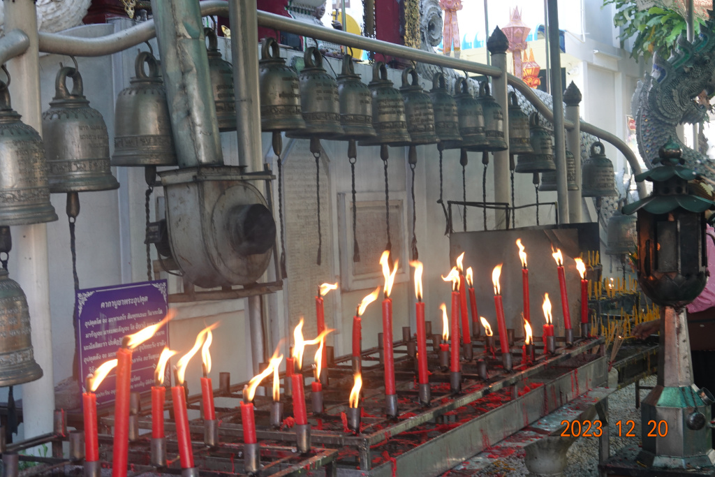 Most of the buildings here appear clean and recently painted or restored. Although crowded together, the buildings are nice. I get the feeling that this is not by any means a “poor” temple. In front of the main viharn (worship hall) was a place where people light candles as an offering (much like in Christian churches). It was very crowded with people and I somehow managed to get a photo without other people. An interesting observation is the size of the flames, much larger than I would have expected.