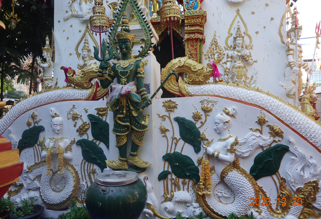 The side of the main viharn is decorated with thewada, and the entrance to the smaller viharn is guarded by two very female-looking water nymphs and a large green yaksha.