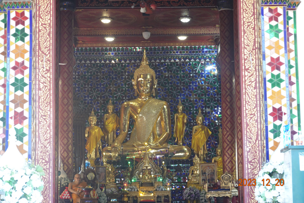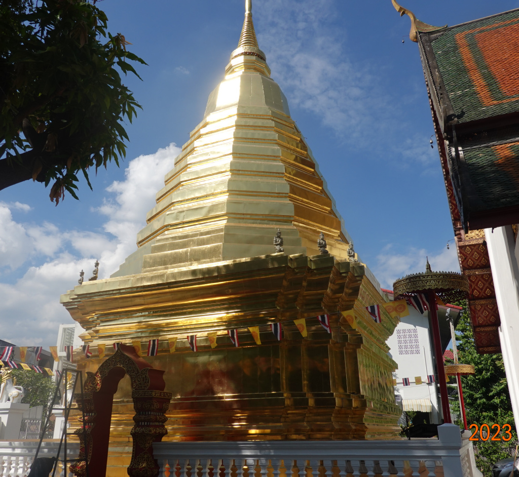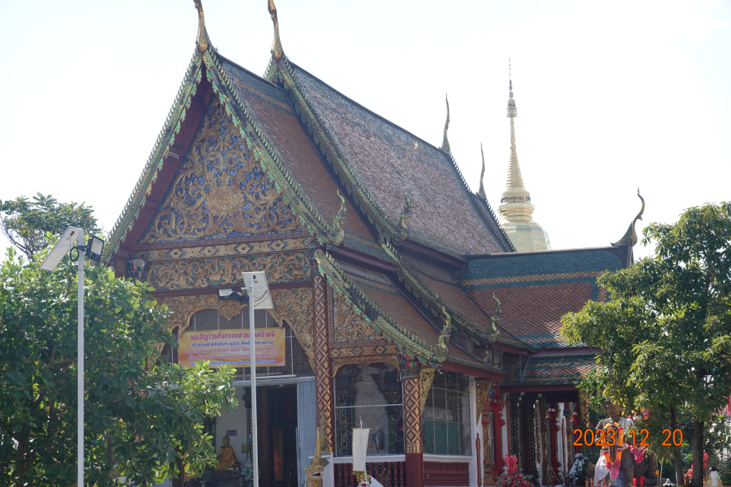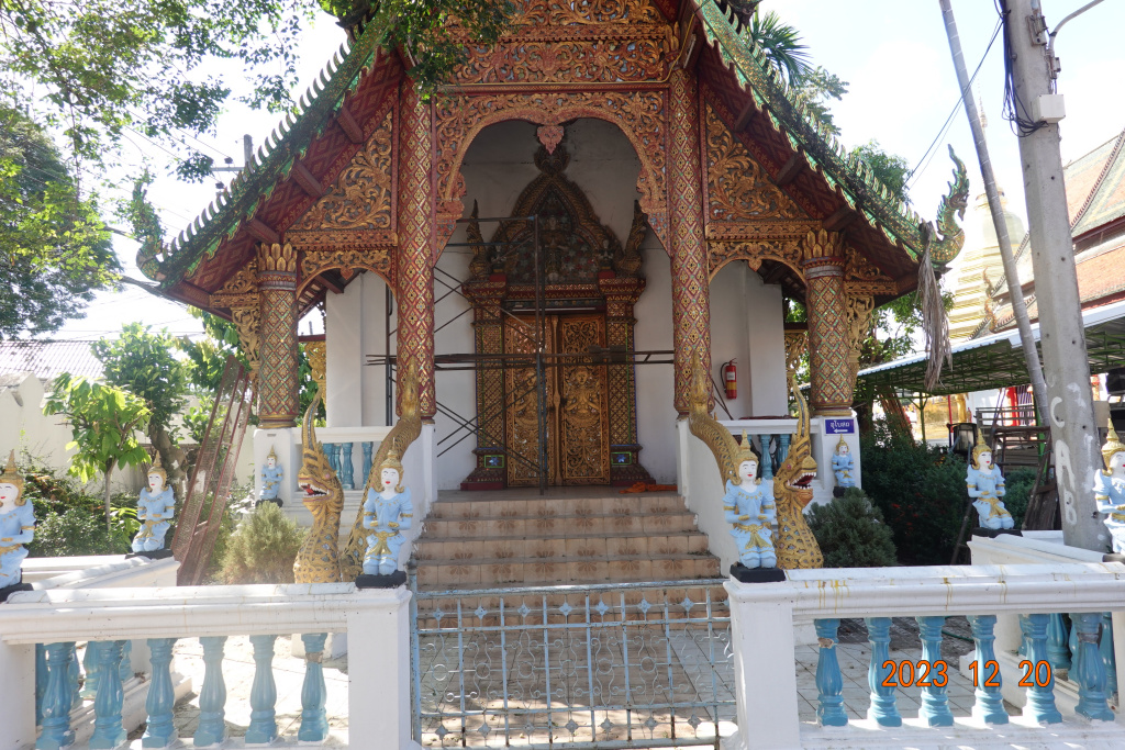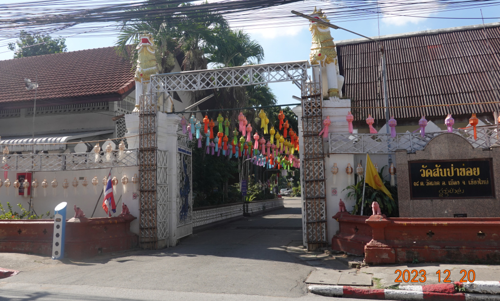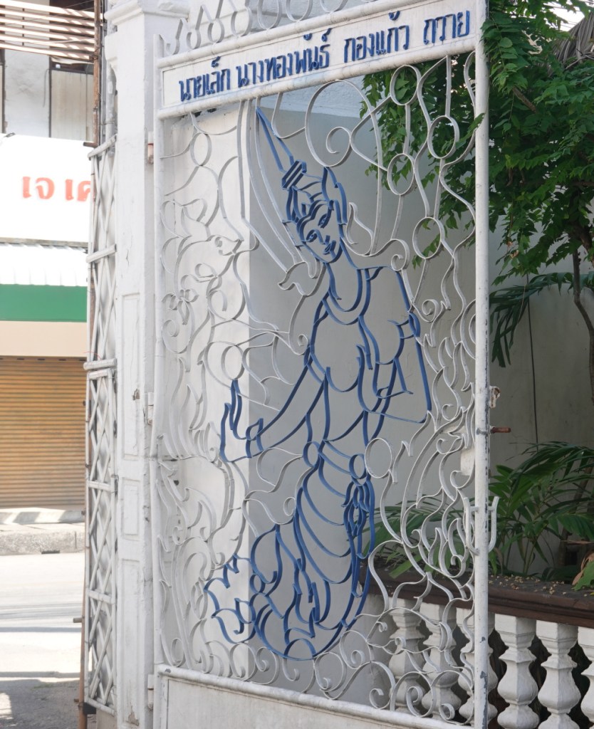 On my way out of Wat San Pa Khoi I noticed the gate had a blue thewada in the design, and also blue letters. The lettering translates to “Mr. Lek Mrs. Thongphan Kongkaew Rao,” likely a tribute to those who donated funds for the gate or made a significant donation to the temple. Very interesting and creative.