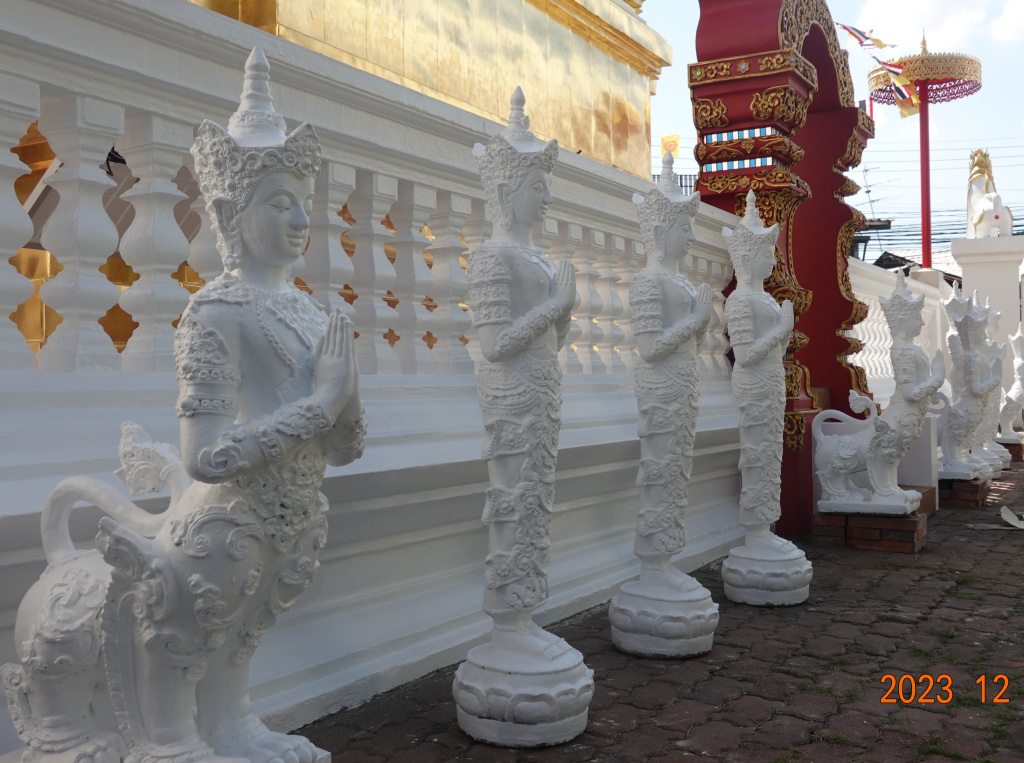 The chedi is very modern-looking and appears to have been recently renovated. It is guarded by a long line of all-white thewada.