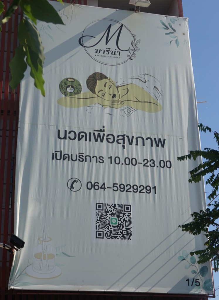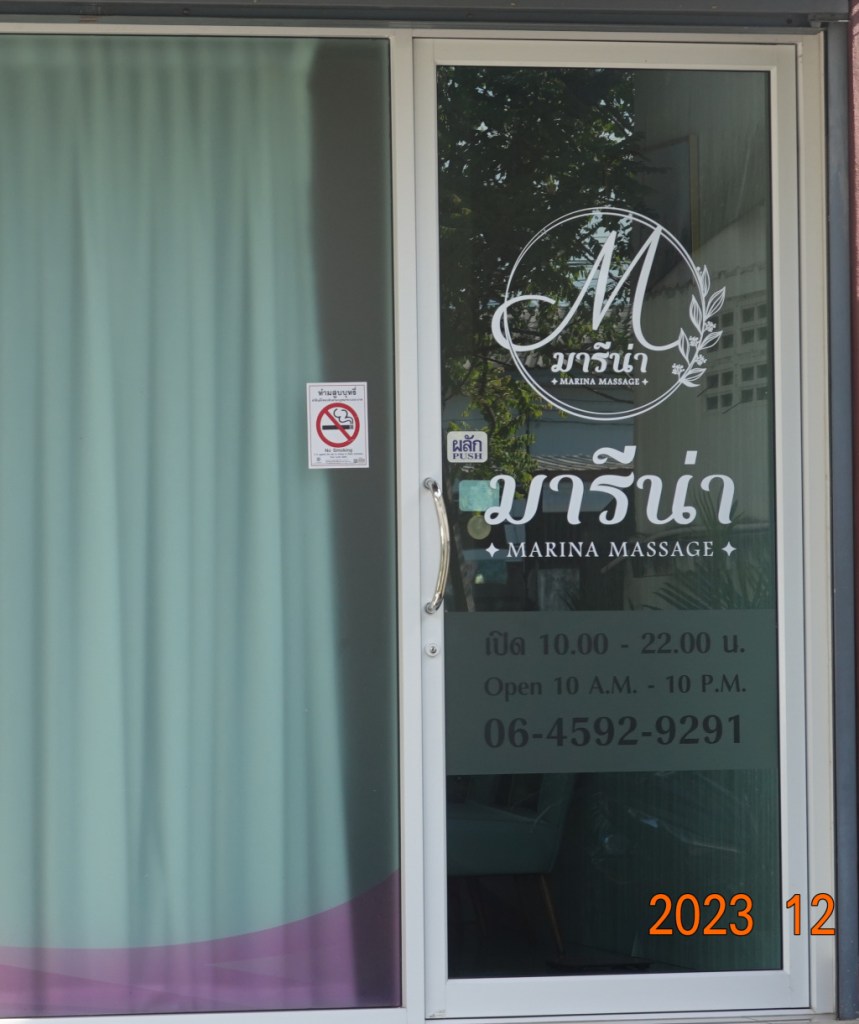 I continued walking south. I got to a point where I wanted to turn right and cross the tracks to visit a temple I had seen on the map. The next road crossing was at least a kilometer south (and it’s hot and I’m getting a little tired). I also noticed to my left a massage shop. This is pretty much the “middle of nowhere,” so it was a bit of a surprise. I suspect this is an erotic massage place, not catering to tourists, but who knows – the name is in English on the sign. The sign on the left says “Massage for Health, open for service 10:00-23:00” and the Thai lettering on the sign on the door on the right says “Marina.”