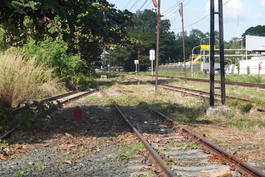 To my right, I saw that someone had placed some boards across the drainage ditch. They looked fairly sturdy, almost like a 4×12, so I went for it and crossed carefully. Looking closely at the tracks as I crossed, I realized that this rail line is “meter gauge” instead of the more standard 4′ 8-1/2″ gauge. Standard gauge is also called Stephenson gauge (after George Stephenson), international gauge, UIC gauge, uniform gauge, normal gauge, and European gauge. Here is a view looking north towards the station as I crossed the tracks. Meter gauge with all concrete ties.