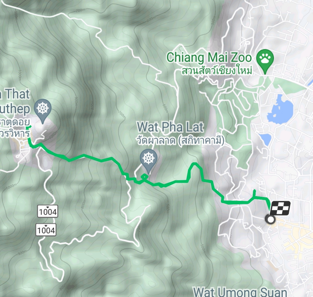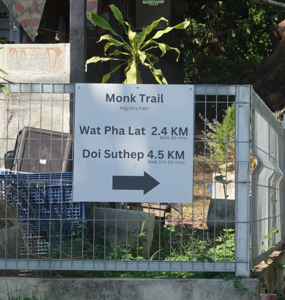 I got a Bolt (like Uber and Grab) ride to a place called Base Camp. This is a hiking/outdoor store and cafe at the end of Suthep Road and the base for hiking the monk’s trail and also other trails on the Doi Suthep mountain. Here is the sign at Base Camp indicating the distance for the monk’s trail and the map from Samsung Health of my hike for the day.