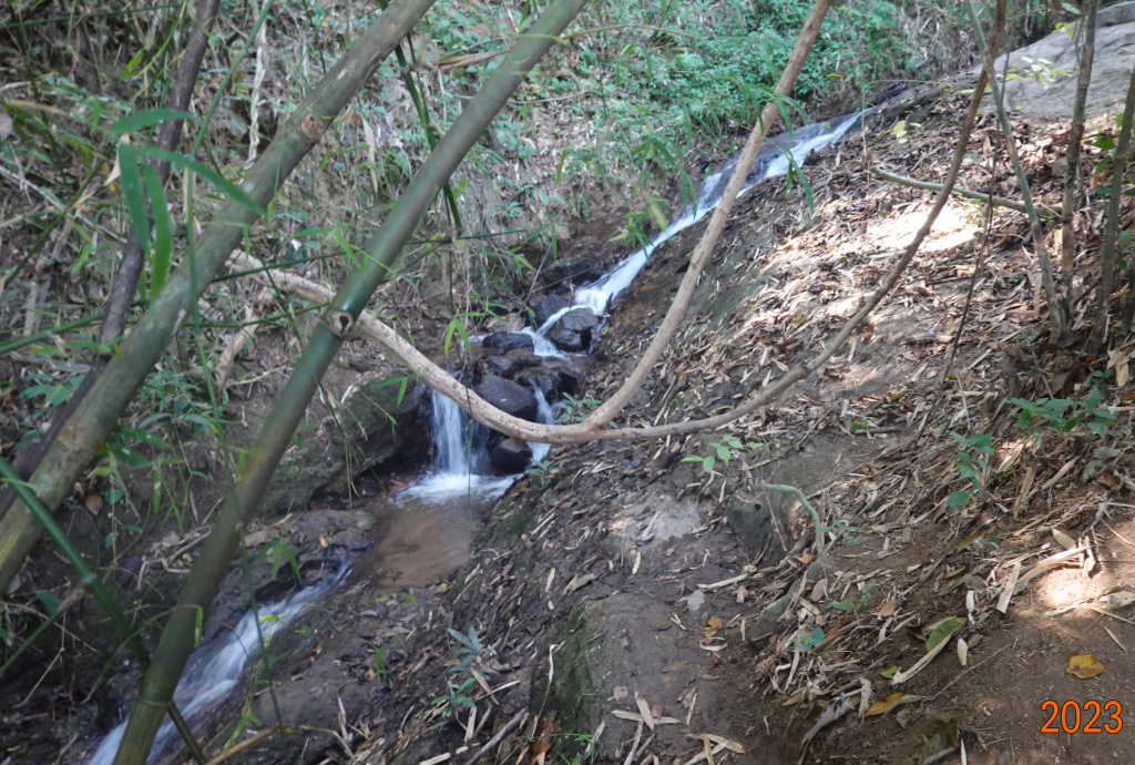 The recent rainy season was a little later than usual, so there is still water running down the various creeks on the mountain. After about halfway up to Wat Phalad, the trail is near a creek and the sound of the creek and waterfalls accompanied us up the trail. At one point where it was particularly loud, I went off the trail to see the creek and got a photo: