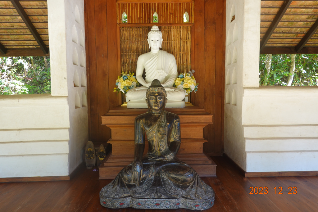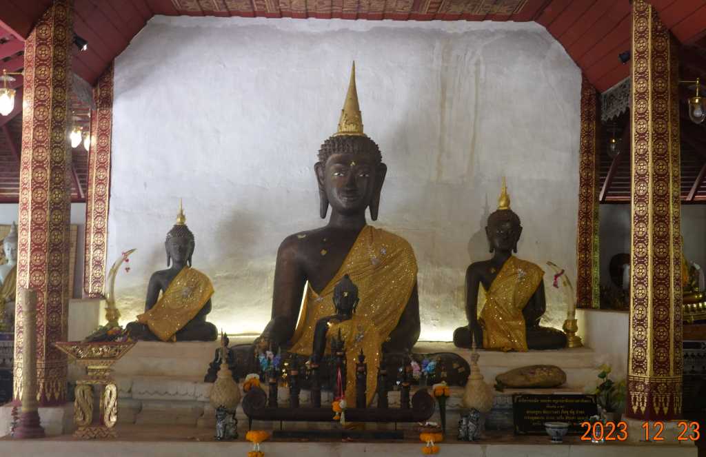 There seem to be steady, some small and some larger, changes at Wat Phalad. There is an open rectangular courtyard where there once was an open-air viharn. On the north side of the courtyard, there is a Buddha image (statue). On the left is this year, on the right last year (the photo is from almost two years ago). Instead of the flowers, a new Buddha image has been added.