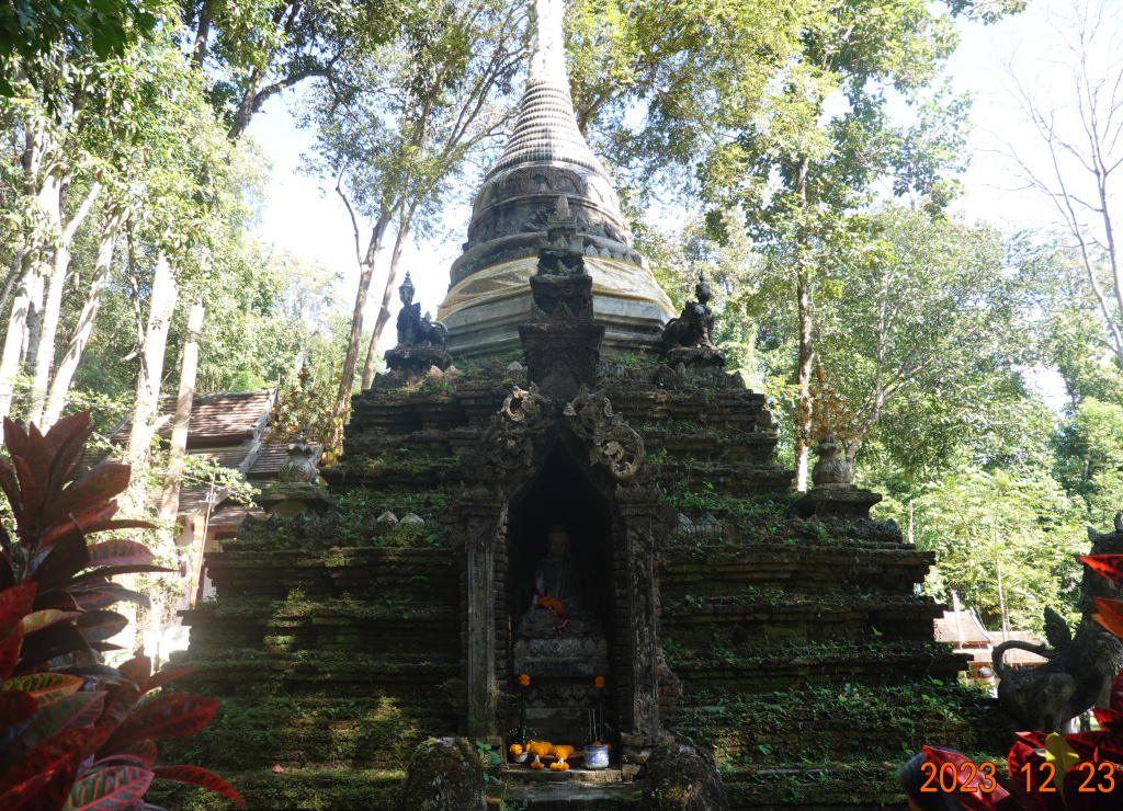 According to the stories, almost halfway up the mountain, the elephant slipped and fell while crossing a small river and waterfall. He got up and continued on up the mountain. Apparently, the elephant’s slipping and falling or sitting down to rest was significant enough to justify building a temple. A Thai phrase for “to slip and fall” is “pah lert”. It is believed that the temple’s short name was originally Wat Pha Lerd, and was later changed to Pha Lad, often spelled Palad or Phalad, and sometimes Pha Lat. Wat Palad was also historically used as a resting place for people making the pilgrimage up to Wat Phra That Doi Suthep before motorized transport became commonplace and easily accessible. It is now known as a meditation temple as it is surrounded by nature, having been built into the forest.
