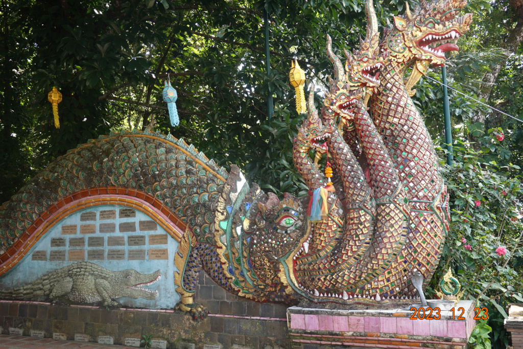 From the end of the hiking trail (where the photo above was taken), it is about 400-500 meters uphill walking along the road to the entrance of Wat Phra That Doi Suthep. Because there are thousands of visitors every day, there are many vendors near the entrance selling fruit, snacks, fruit juice, trinkets, and souvenirs. I bought and drank a freshly squeezed orange juice – tasted so good after the long, hot, sweaty hike. I went into the temple grounds and stopped at a statue of the earth deity Phra Mae Thorani (Mother Earth). From an earlier post I made this year, “According to Buddhist myths, Phra Mae Thorani is depicted as a young woman wringing the cool waters of detachment out of her hair to drown Mara, the demon sent to tempt Gautama Buddha as he meditated under the Bodhi Tree.” Statues of Phra Mae Thorani are seen at many temples in and around Chiang Mai. I had forgotten that this statue was here at Wat Phra That Doi Suthep.