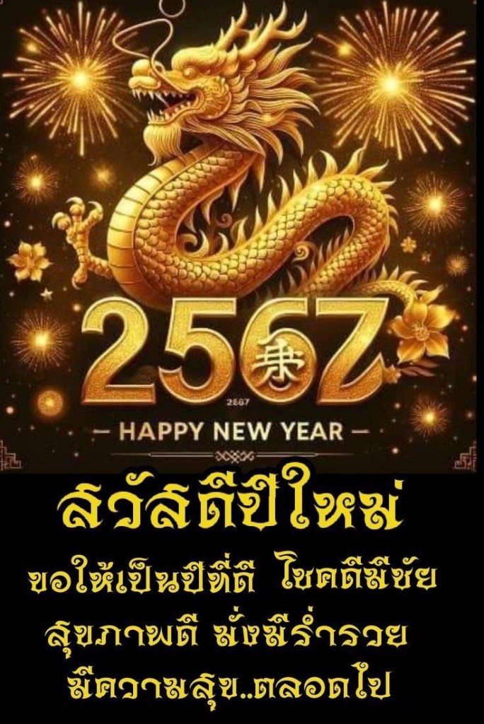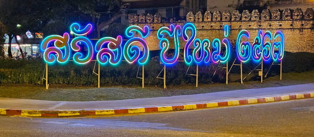 You are probably wondering why the Thai greeting starts with 2567. The official year in Thailand is the Buddhist year, based on the death of the Buddha in 543 BC. So this works out to the Gregorian (international) year plus 543 years, or 2024 becomes 2567. The rest of the greeting says: