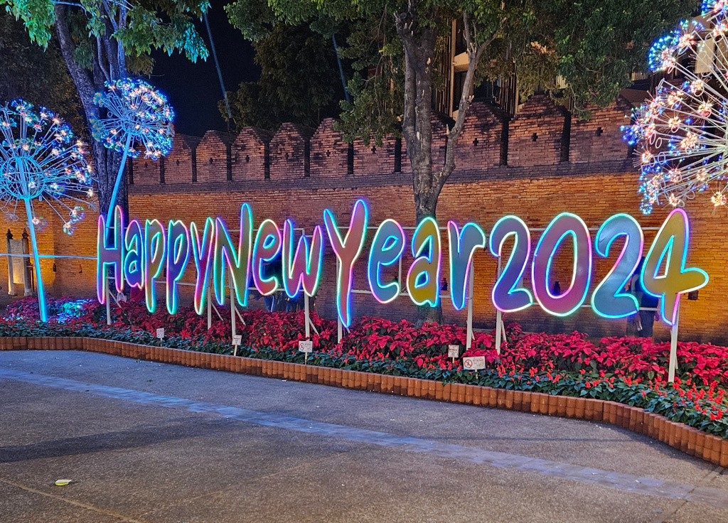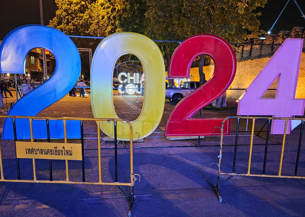 Many decorations around Tha Phae Gate, including this 2024 sign that was blocked off and turned off until the official New Year’s Eve countdown.