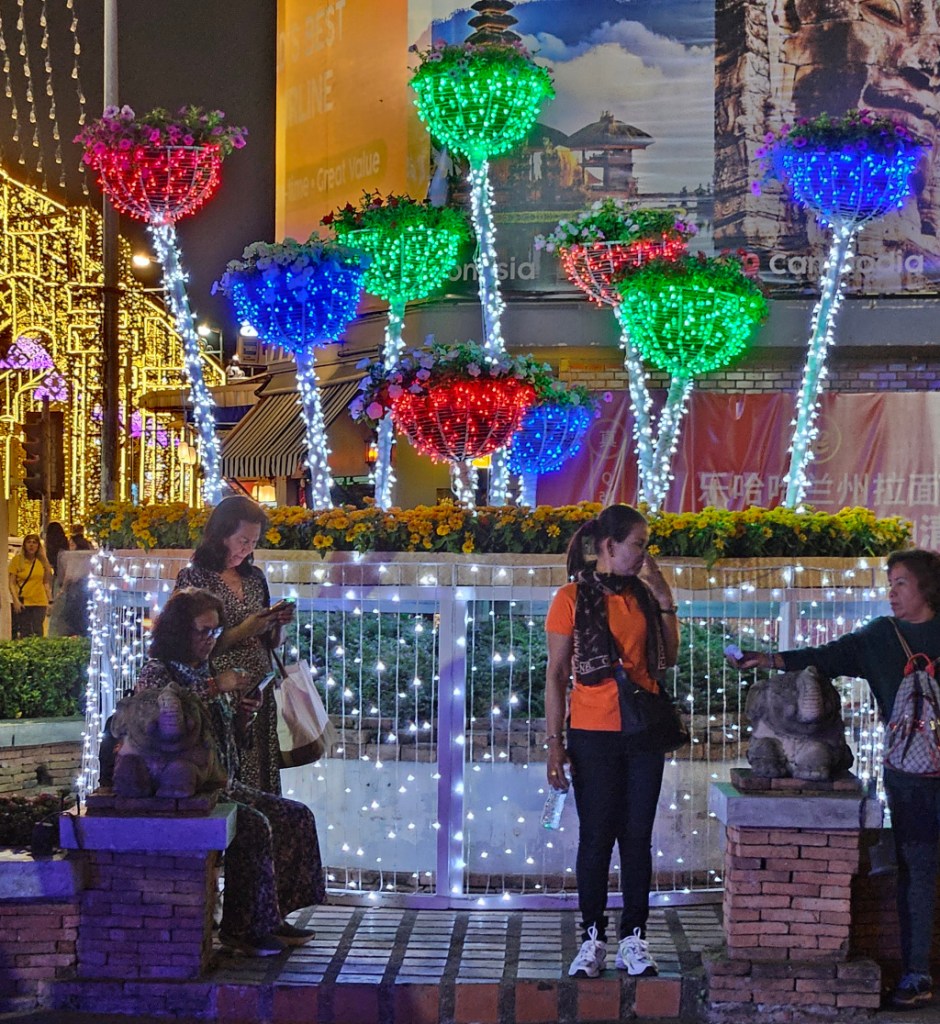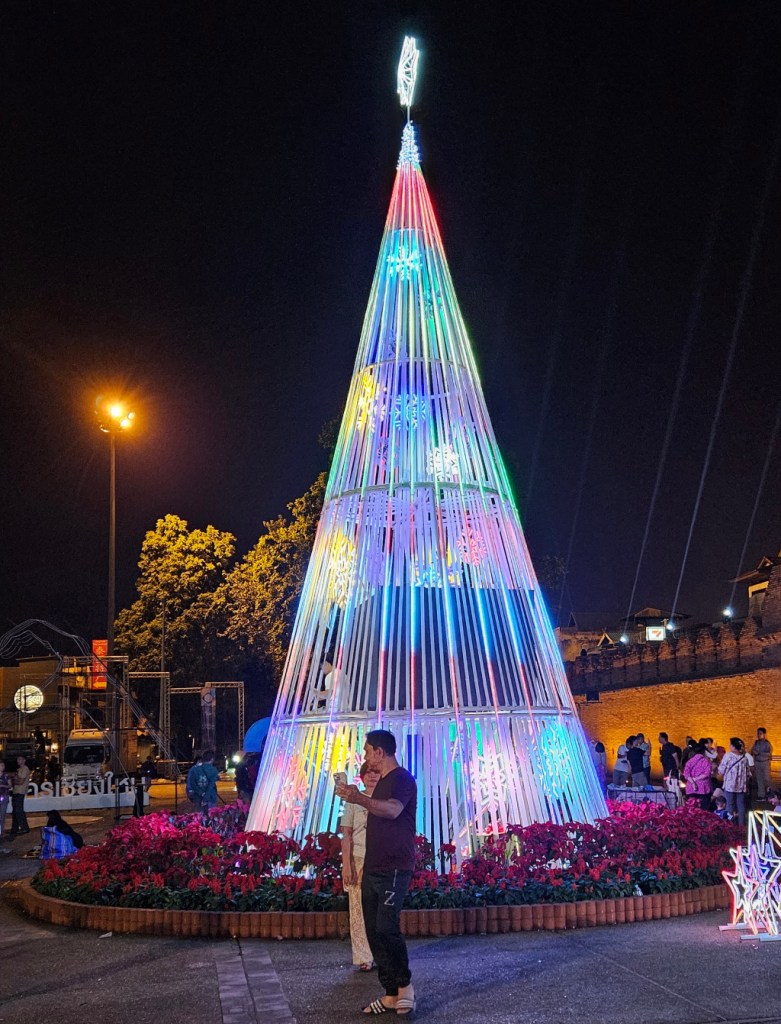 The decorations have evolved. With the proliferation of social media and people wanting to share pictures of themselves, the decorations seem to be designed to facilitate that. In a country where about 95% of the people are Buddhist, the spread of the Christmas celebration is a curiosity. The aspect of Christmas that Thai people have embraced is the family celebration and gift-giving. So there are Merry Christmas signs here and there, and Christmas trees in various places. At Tha Phae Gate, where the decorations are centered, there is a large, colorful Christmas tree that changes colors and is continually the backdrop for photos.