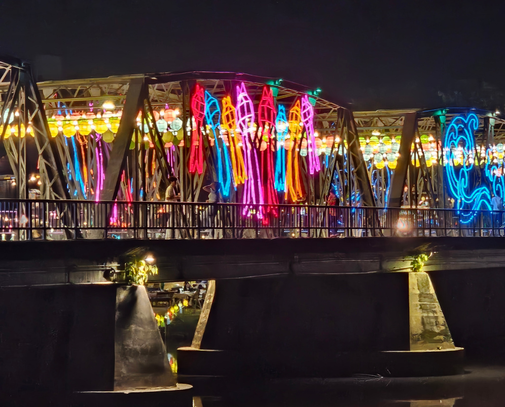 The lady in the bright green on the left and the man in the suit to the right are the masters of ceremonies. After staying and watching the performances and the growing crowd, I left to walk down to the Iron Bridge. Last year, there were so many people on the Iron Bridge that vehicles could not get through. The Iron Bridge was a good place to see the unofficial fireworks being shot off at the Nawarat Bridge about 500 meters upriver (and there were a LOT of those fireworks). This year, however, there were almost no people at all at the Iron Bridge. I walked across and noticed that the Tourism Authority of Thailand office was nicely decorated with bright, festive lights: