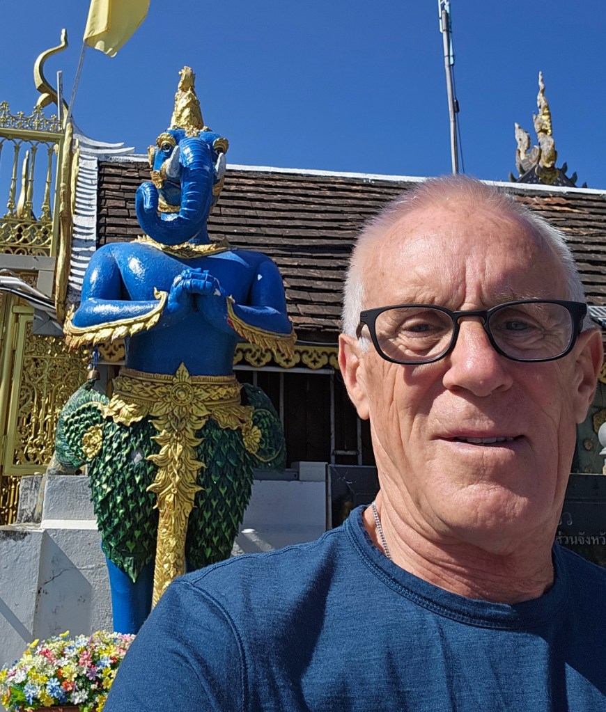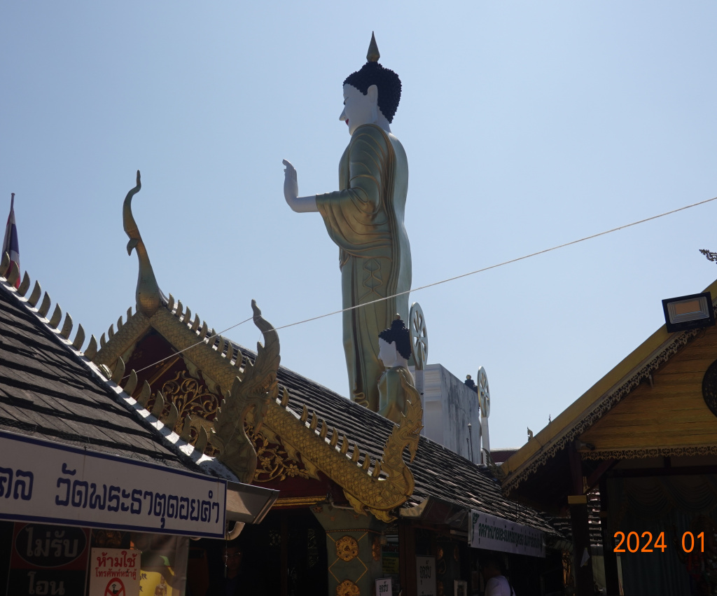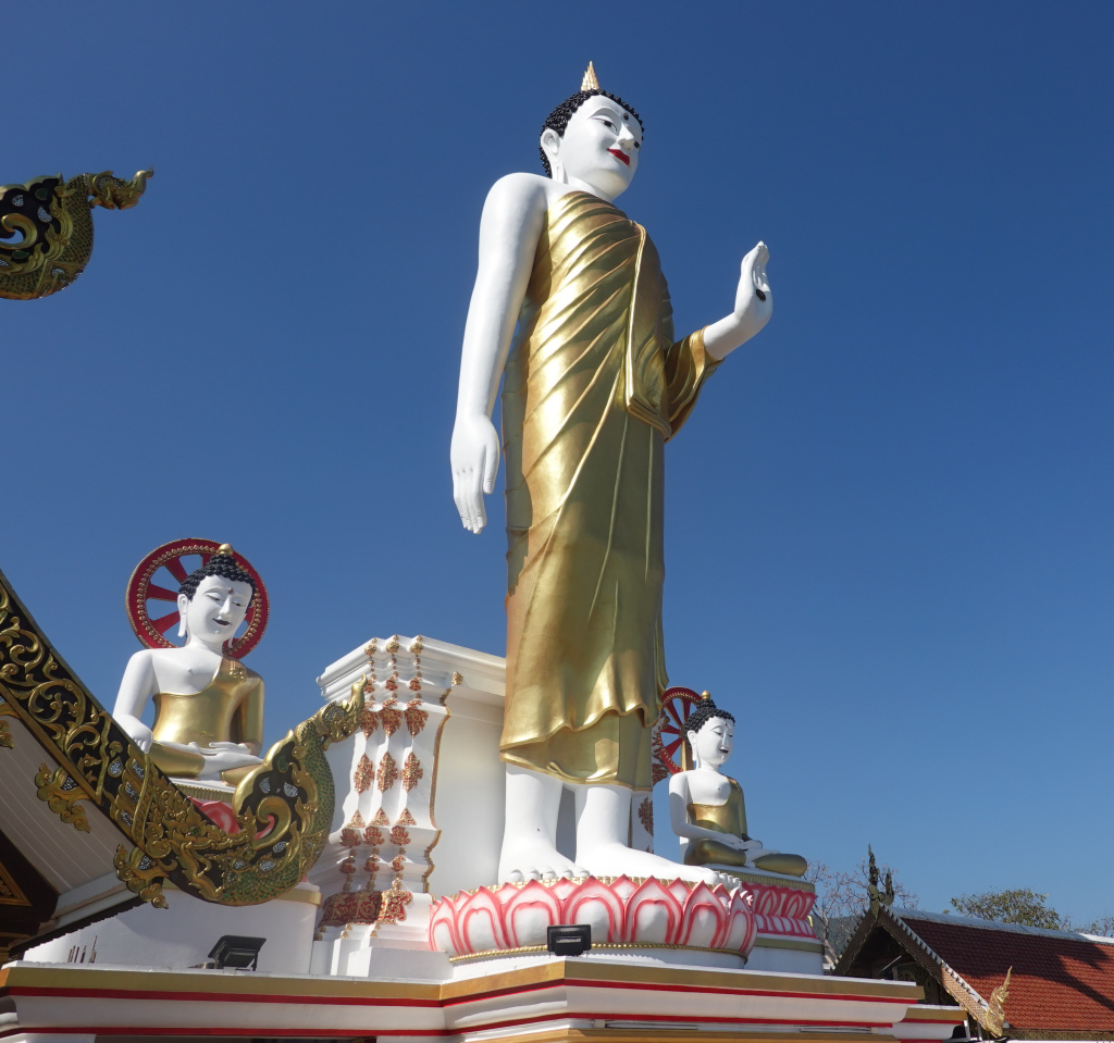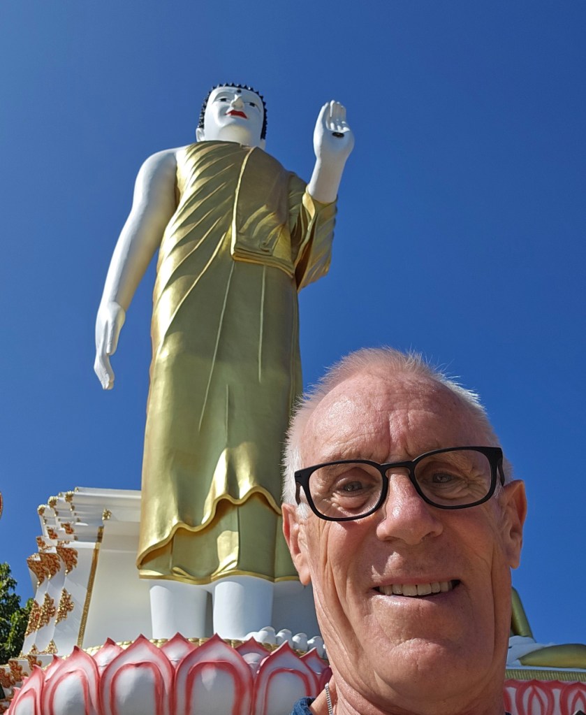 It is difficult to get a good photo of the large standing Buddha because the overlook is not deep enough. I backed into the farthest corner and got a photo, then a selfie to prove again that I was here…if there was doubt. A drone with a camera might give a better photo; I know little about drones, and think I have heard that their use in Thailand is highly restricted.