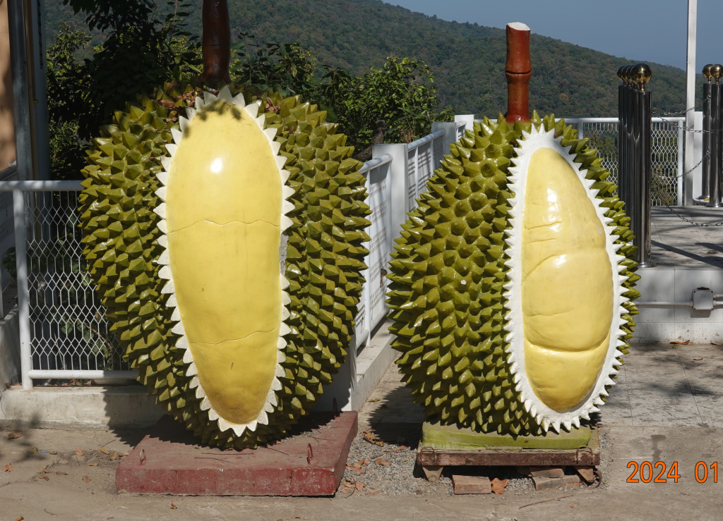 Near the large seated Buddha I noticed these very large statues of durian fruit. A fully-grown durian is about 1 foot long. Unclear why large statues of fruit would be here, but whatever the reason, there are two statues of durian near the large seating Buddha.