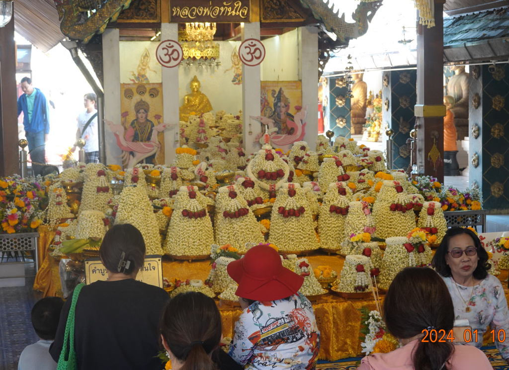 In the temple itself, there is also “Luang Por Tun Jai,” the Buddha image of success which people come to worship and make a wish. If your wish comes true in 3 months, you must return to fulfill your promise with at least 50 jasmine garland flower offerings. There is a large pile of garlands on the table in front of the small chapel with the Buddha statue. The two times I have been here, the room is packed with people praying.