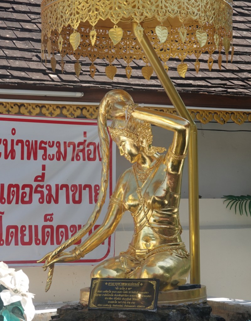 And, like at many temples, there is a statue honoring Phra Mae Thorani, the goddess of the earth or mother nature. This is shiny gold, not my favorite style.
