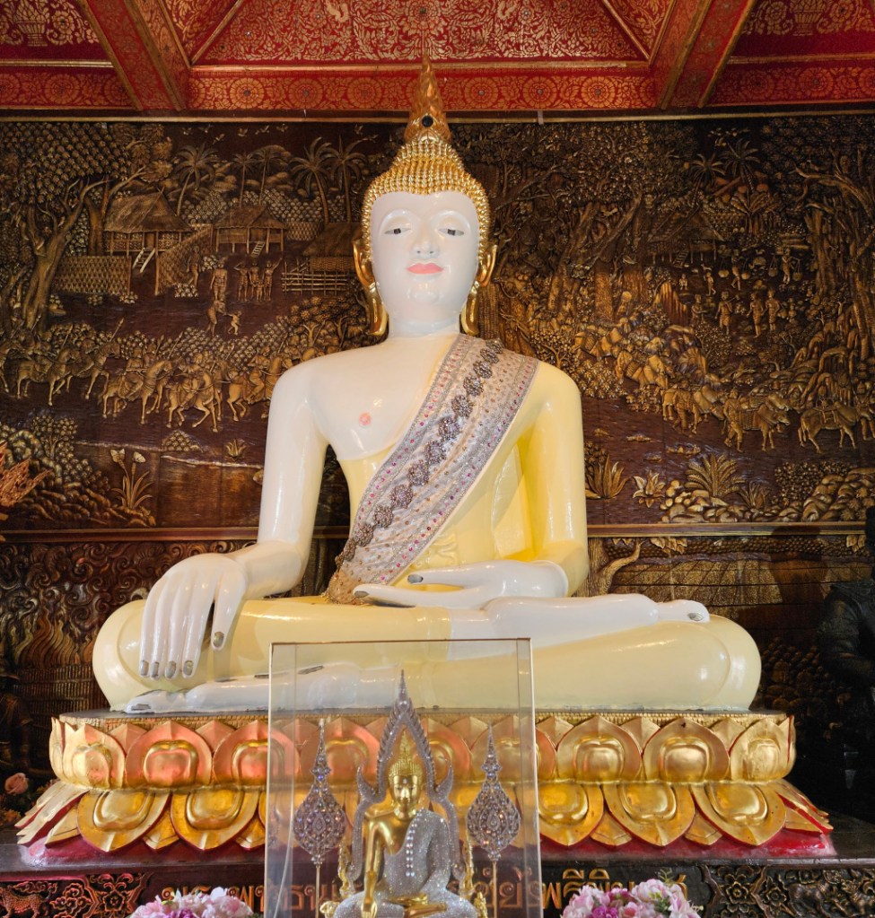 One of the most noted features or attractions of the temple is the large white teak Buddha which dates from the 1600s. This is the largest teak Buddha in all of Thailand. It was made in celebration of the victory over the Burmese and their expulsion from Northern Thailand. It was made in the Chiang Saen style of Northern Thailand and sits in the customary Subduing Marra mudra with the right hand towards the ground. The photo does not really show the scale well; this statue is almost 3 meters (10 feet) high – a large teak statue.
