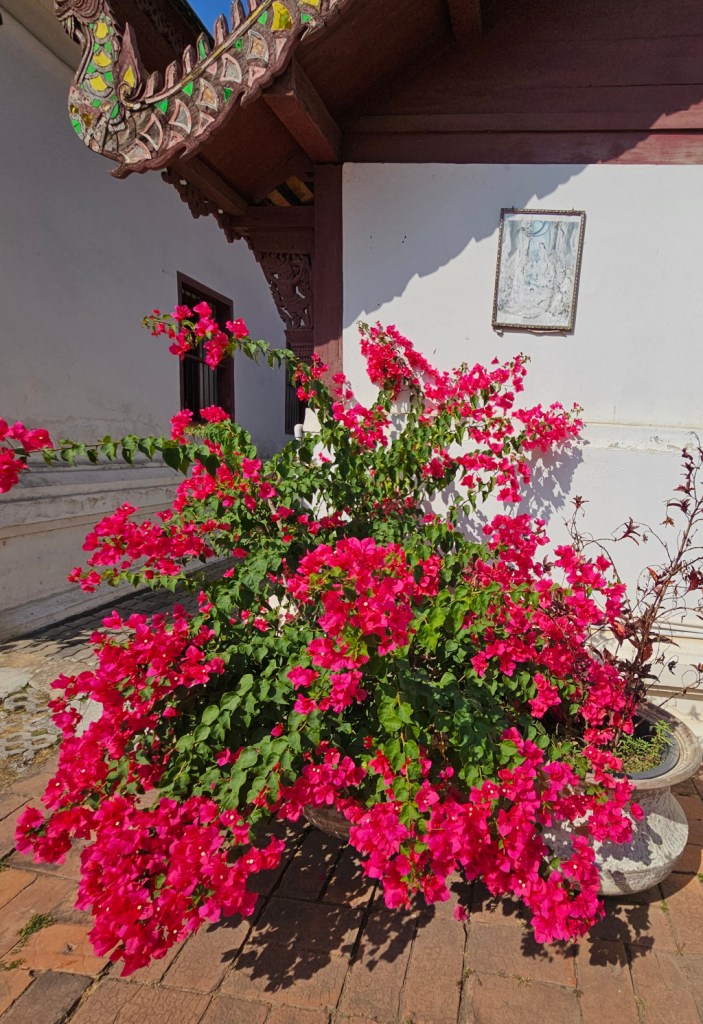 As is common in southern California and also northern Thailand, bougainvilleas are commonly seen adding color and cheerfulness, sometimes in odd places. As I walk through the sois (avoiding the main road and the busy traffic) my first view of the back of Wat Buppharam is the photo on the left and there are bougainvillea within the temple grounds.