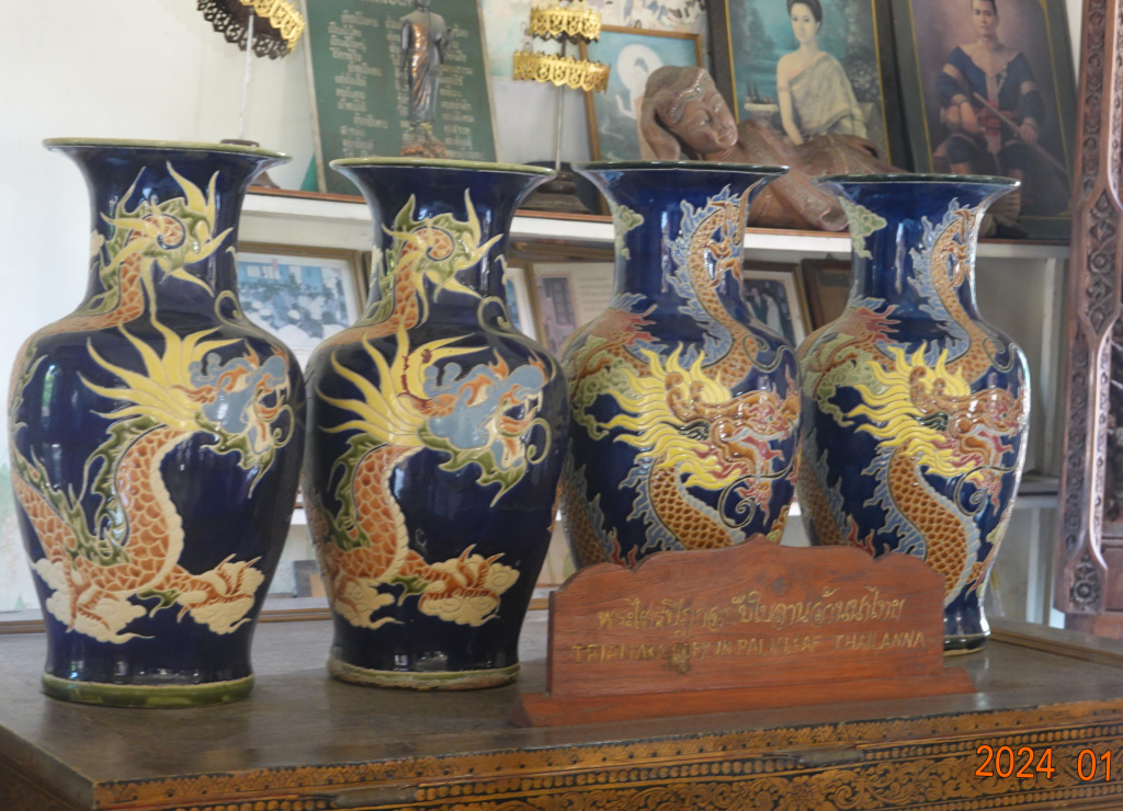 The old, rustic wooden crypts holding Buddhist texts and temple documents are in stark contrast to the shiny ceramic vases.